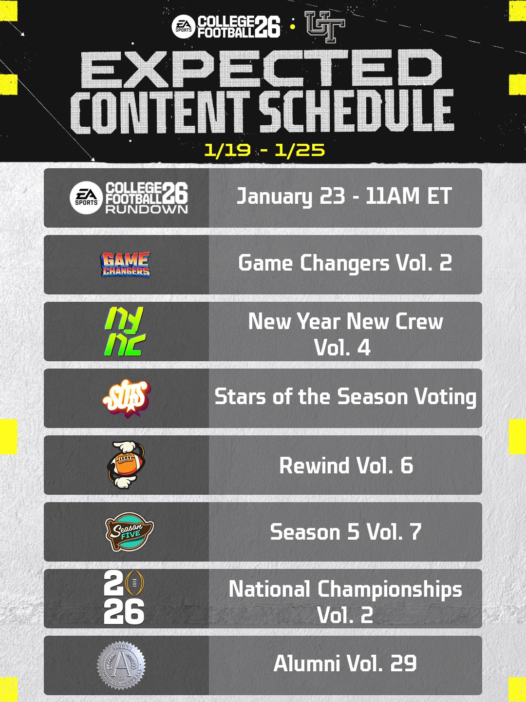 Weekly CUT Schedule (1/19-1/25)