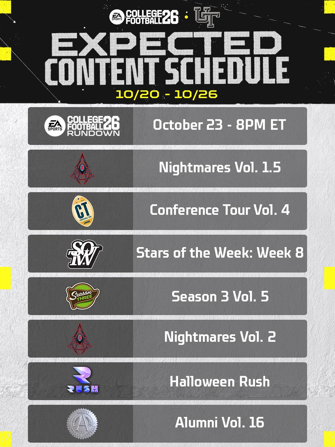 Weekly CUT Schedule (10/20-10/26)